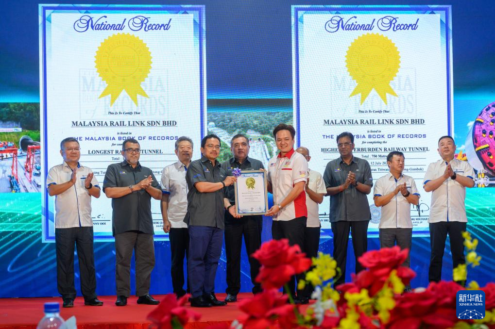 这是7月12日在马来西亚彭亨州拍摄的马来西亚东海岸铁路(马东铁)项目云顶隧道贯通仪式现场。